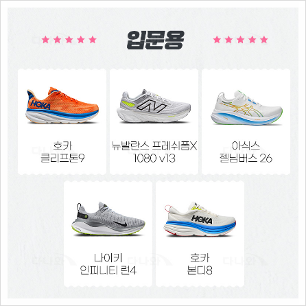 | 입문용 | 쿠셔닝 위주의 일상 러닝화 | 호카 ‘클리프톤9’, 뉴발란스 ‘프레시폼’ |