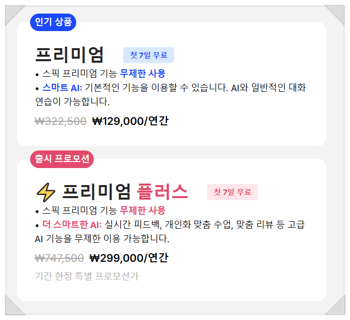 스픽은 꾸준히 할인 이벤트와 코드를 제공하고 있어, 시기만 잘 맞춘다면 합리적인 가격으로 고품질 영어 학습을 시작할 수 있습니다. 장기적으로 학습할 계획이 있다면 평생이용권도 적극 고려해볼 만한 옵션입니다.