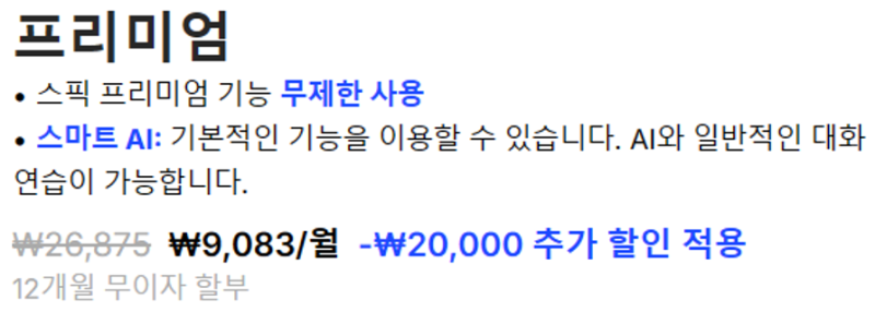 스픽의 기본 요금제는 월 정기 결제 방식입니다. 2025년 기준 한달 요금은 월 10900원으로 책정되어 있으며, 프로모션 없이 정가 기준입니다. 다만, 앱 내에서는 가끔 '첫 가입자 할인'이나 '이메일 인증 할인' 등으로 몇 퍼센트씩 할인된 가격이 제공되기도 하므로, 가입 전에 할인 적용 여부를 반드시 확인하는 것이 좋습니다.