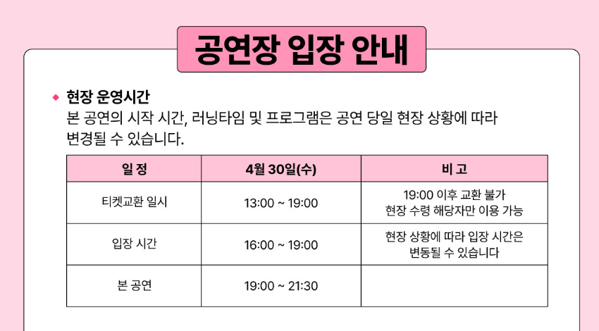 모든 티켓은 본인 인증을 기반으로 발급되며, 양도나 재판매 시 입장이 제한될 수 있다. - 좌석 배정 방식